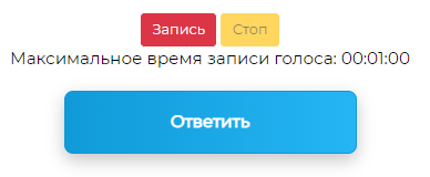 Существуют вопросы, предусматривающие запись голоса — устные сообщения и рассказы. В таких вопросах над кнопкой ОТВЕТИТЬ появятся две дополнительные кнопки — начала и конца записи, а под ними сообщение о максимальной продолжительности звукового сообщения: