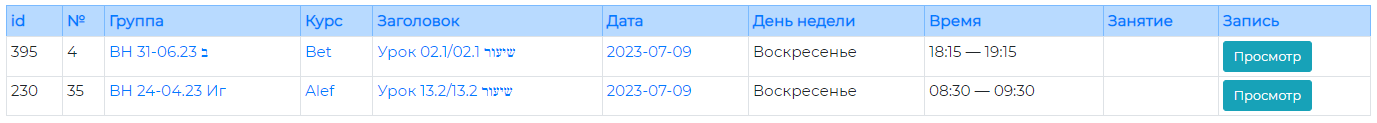 В столбце ГРУППА указано название группы, занятие в которой описано в данной строке, в столбце КУРС – название курса, в столбце ЗАГОЛОВОК – название урока, ДАТА – дата занятие, в столбце ДЕНЬ НЕДЕЛИ – соответствующий день недели, а в столбце ВРЕМЯ – время занятия. Нажатие на выделенный цветом текст из этих столбцов (например, на название той или иной группы, конкретного курса или выбранной даты) позволит отфильтровать строки по выбранному параметру и выдать только те из них, в которых этот параметр будет соответствовать выбранному. Например, нажав на дату 2023-07-09 (9 июля 2023 г.) получим следующий результат (это – только пример, относящийся к преподавателю, работающему в нескольких группах):